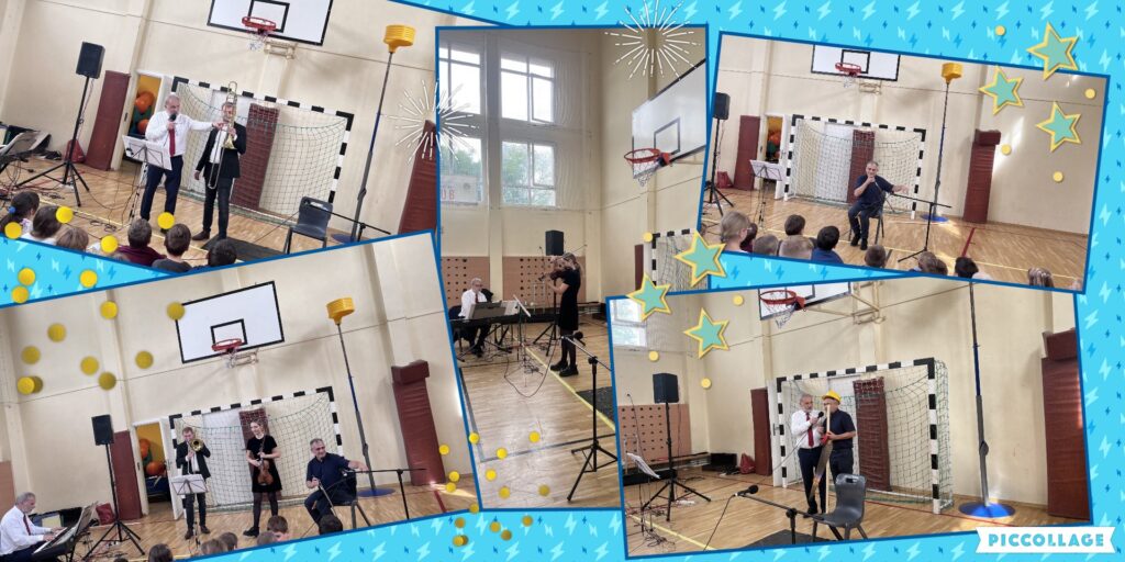 Dnia 16 września 2025 r. w naszej szkole odbył się koncert rozpoczynający cykliczne spotkania z muzyką. W koncercie wzięli udział: skrzypaczka, pianista oraz muzyk grający na pile. Ten ostatni szczególnie przypadł do gustu publiczności. W żartobliwy i pełen humoru sposób pokazał, że można też grać na pile. Muzycy zagrali kompozycje klasyczne, jak i przykłady lżejszej, weselszej muzyki.